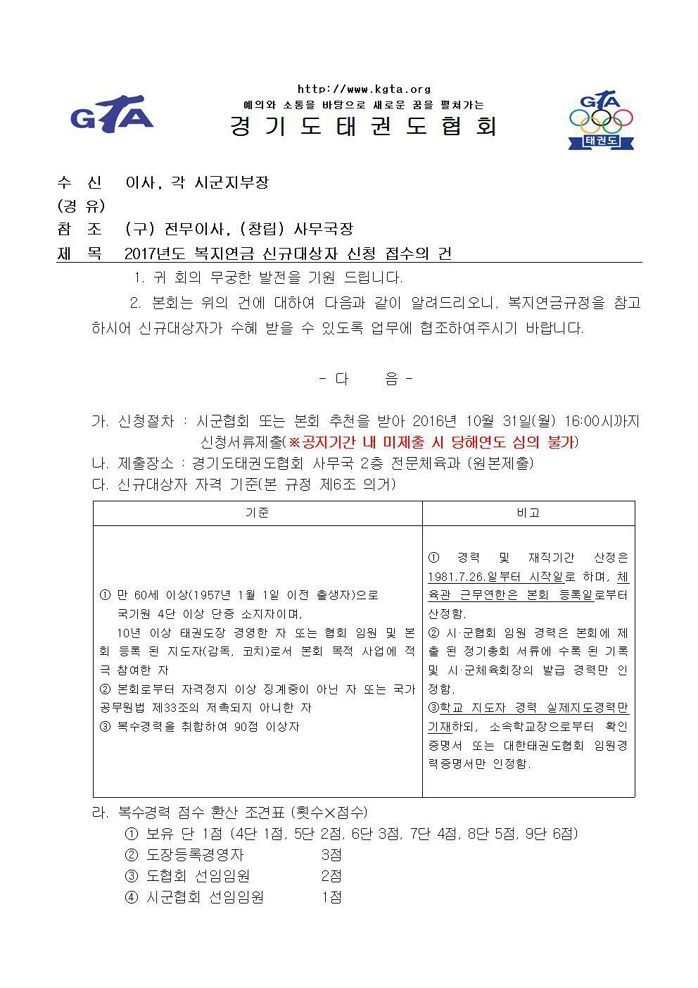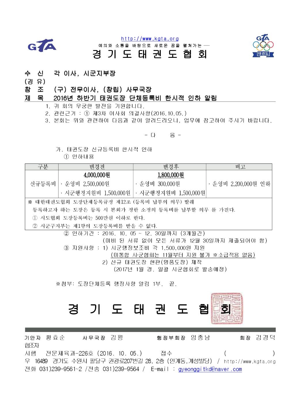 2016년 9월 4일 경기도태권도협회 국기원 정기심사 일시 및 장소변경 알림의 건
