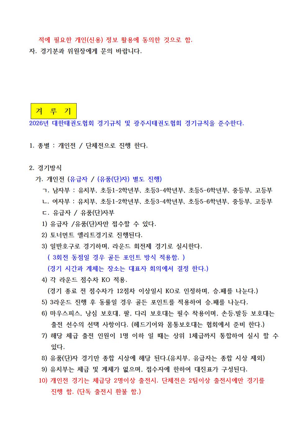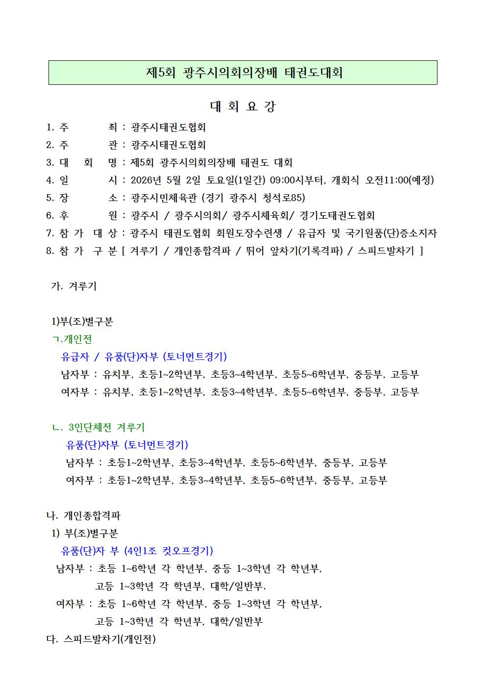 | 8 | 제 5회 광주시의회의장배 대회 요강 c image | 황현수(경희대강찬도장) | 63 | 어제 오후 02:51 |
